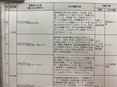 障がい者の余暇活動の充実を目的として、サッカー、音楽、美術、山登りの4つの活動を企画・運営している。大分大学サッカー部、現職・退職教員、福祉施設職員等の多くの支援者が参加しており、当事者の生活意欲向上や社会参加の促進や、大学生等による障がい理解につながっている。